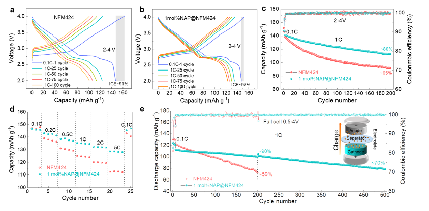 (a)NFM424和(b)1 mol%NAP@NFM424在2.0-4.0 V的电压范围内的首次恒电流充放电曲线。(c)在2.0-4.0 V的电压范围内,1C倍率下的200周的循环性能。(d)在2.0-4.0 V的电压范围内的倍率性能。(e)0.5-4.0 V电压范围的1C倍率循环的放电比容量和库仑效率的保持情况。
