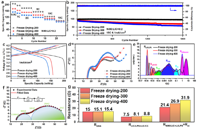 在电解质合成过程中,烧结温度往往会影响SE的结晶度和粒度。为了更好地将冷冻干燥法与传统的水合法和球磨法进行比较,首先探讨了三种不同烧结温度(200–400°C)的影响。为了更好地显示三种不同烧结温度对SE的影响,进行了一系列电化学表征,如图2a所示,组装含有80%活性正极材料的ASSB进行倍率性能测试,具有200°C烧结SE(FD200)的ASSB即使在初始充电倍率为0.5 C时也能提供207 mAh/g的比容量,而300°C和400°C烧结的SE的放电比容量分别为174.4和153.5 mAh/g。同时,在15 C和6.1 mA/cm2的电流密度下,还对组装有三种不同SE的ASSB进行了循环测试(图2b)。可以看出,经过1800次循环后,FD200电池的容量几乎没有衰减,而FD300电池和FD400电池的容量保持率分别只有75%和64.7%。为了进一步了解不同SE对电池每个界面的具体影响,对以1mAh/cm2充放电的电池进行了阻抗测试(图2c,2d)。同时,为了消除主观因素造成的阻抗拟合的不合理性,引入弛豫时间分布(DRT)对阻抗数据进行拟合,为峰值分离提供客观依据。DRT拟合结果如图2e所示。其中图2e中Rdiffusion对应的特征峰仅由软件自动拟合,实际数据中不存在对应的频率。因此,可以获得与每个电池的阻抗相对应的不同界面的特定频率进行拟合。如图2f所示,以FD400电池的阻抗为例,我们可以看到不同界面的对应频率分别为110 kHz、9 kHz、1 kHz、25 Hz和1 Hz。110kHz对应于Li3InCl6和Li6PS5Cl(LIC/LPS)之间的频率,9kHz对应于复合正极中的LIC和集流体(LIC/CC)。负极/LPS(Li/LPS)的频率为1kHz。25Hz归因于NCM90和LIC界面(Ni90/LIC)。1Hz与正极和负极处的电荷转移(ct)相关。然而,值得注意的是,尽管这种方法可以客观地获得不同界面对应的真实频率,但由于阻抗值相似,阻抗被分为三部分进行拟合(如图2g所示)。Rohm表示ASSB的欧姆阻抗,RLIC/LPS+LIC/CC(R2)表示卤化物LIC SE层和硫化物LPS SE层之间的界面阻抗之和以及复合正极中的卤化物SE和集流体之间的界面电阻。RNi90/LIC+Li/LPS+Rct(R3)表示复合正极中活性材料NCM90和LIC SE之间的界面阻抗以及硫化物SE LPS层和负极之间的界面电阻以及Rct阻抗的总和。图2g显示阻抗值的差异主要集中在R3中。由于电池具有相同的负极结构,因此该数据的差异归因于Ni90/LIC,其包括阴极活性材料和LIC之间的界面阻抗以及它们之间的Rct。这种差异的原因可能是由于烧结温度的升高,这将导致电解质颗粒的直径增加,无法在阴极中形成稳定的导锂网络。为此,我们已经明确使用200℃的烧结温度可以获得最佳的LIC。